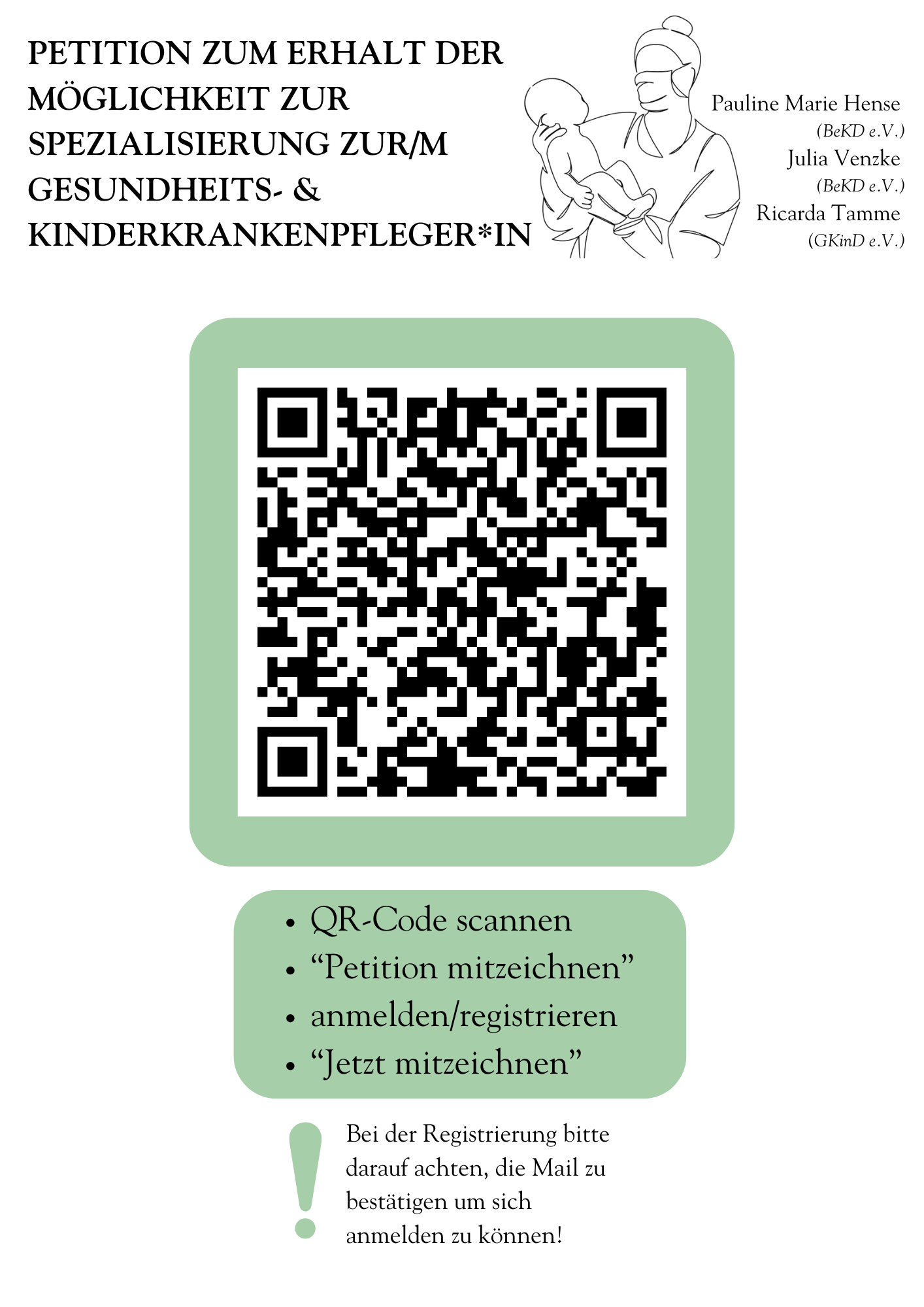 Die Petition setzt deshalb ein starkes Signal: Die Möglichkeit zur Spezialisierung muss erhalten bleiben, damit auch in Zukunft ausreichend qualifizierte Gesundheits- und Kinderkrankenpflegerinnen und -pfleger ausgebildet werden können. Nur so ist es möglich, den besonderen Anforderungen dieser Patientengruppe gerecht zu werden.