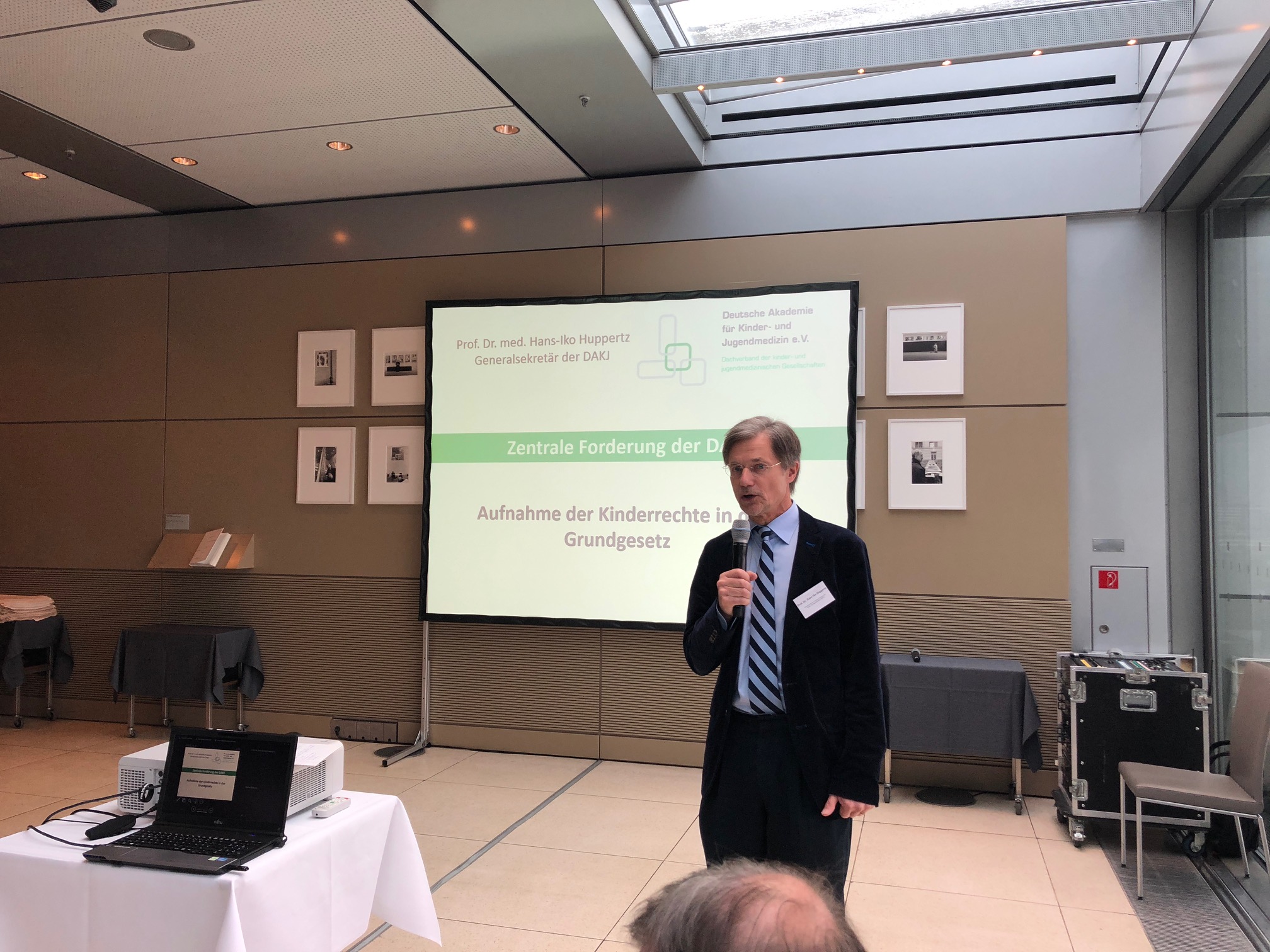 Der Generalsekretär der DAKJ, Prof. Dr. Hans-Iko Huppertz , begrüßte die Gäste, erklärte die Rolle der DAKJ als Dachverband der deutschen kinder- und jugendmedizinischen Gesellschaften und Verbände und führte die Zuhörer anhand einiger anschaulicher Beispiele seiner Tätigkeit als Leiter der Bremer Kinderklinik kurz in die Thematik ein. Er appellierte an die Parlamentarier, die von den Regierungsparteien im Koalitionspapier in Aussicht gestellte Aufnahme der Kinderrechte ins Grundgesetz zu unterstützen. Kinder sollten als eigenständige Rechtssubjekte ins Grundgesetz aufgenommen, der Vorrang des Kindeswohls bekräftigt und das Recht auf Schutz, auf bestmögliche Förderung sowie auf Beteiligung und altersangemessene Berücksichtigung ihrer Meinung festgeschrieben werden.